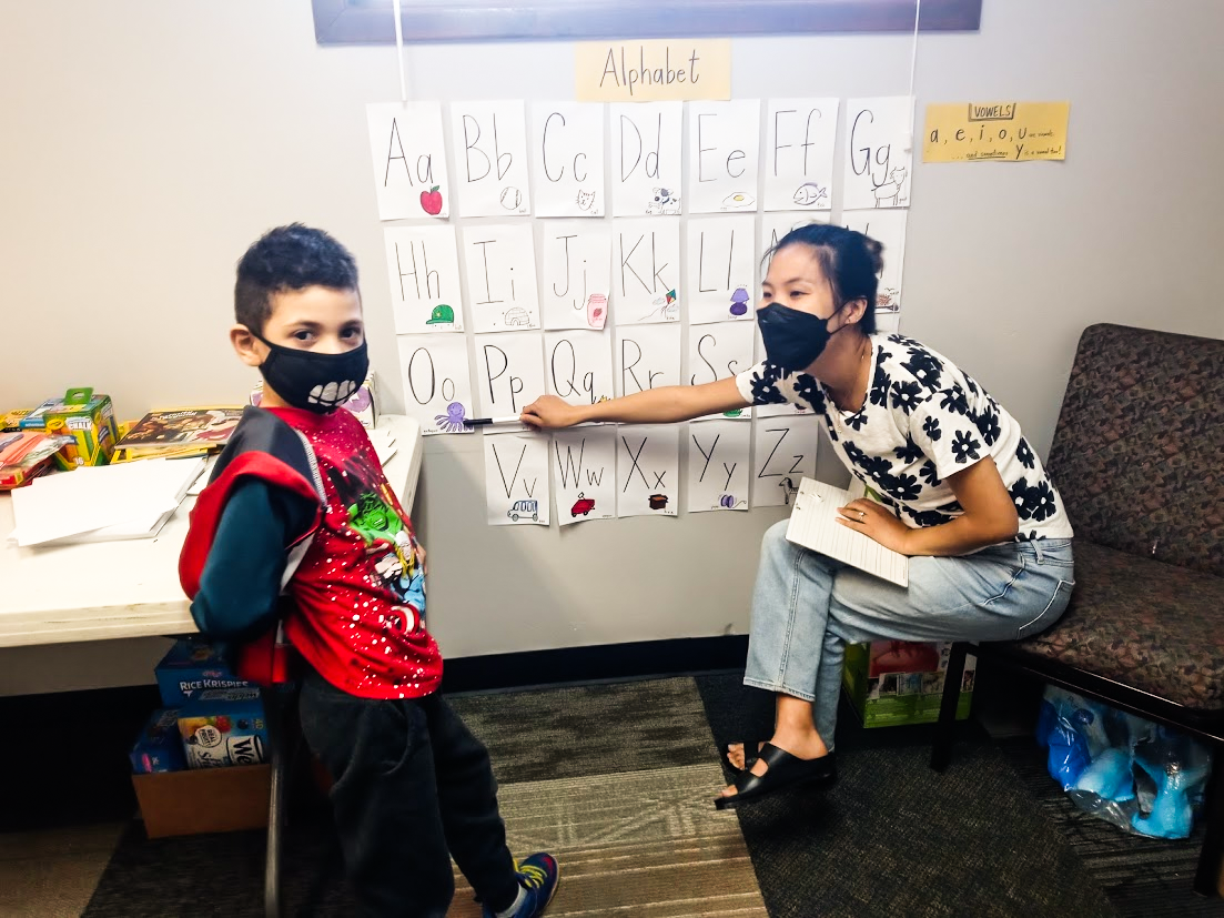 Lennox with volunteer tutor Lydia in 2021, when he first joined the Education Enrichment Program; he was working on phonetics and writing skills.